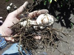 球根の生育状況については、1年栽培、1.5年栽培及び2年栽培球のいずれも順調に生育しています。例えば1年栽培球で、かなり大雑把な言い方になってしまいますが、植付けサイズが10/12cmであれば、16/18cm前後にまで大体の品種が肥大していました(もちろん品種によって差はあります)。試し掘りの最中、掘り上げた球根のサイズを見るたびにニュージーランド人とオランダ人はみんなで「Almost there」=「あ~、もう少しだねえ(あと1サイズで目標サイズに到達するので、掘り取りまでに十分とどくだろうな)」としきりに言っていました。ただ、2年栽培球に関しては、視察時の段階では、品種によっては僅かながら肥大しすぎの感もありました。うまく帳尻を合わせてくれるようお願いしておきました。