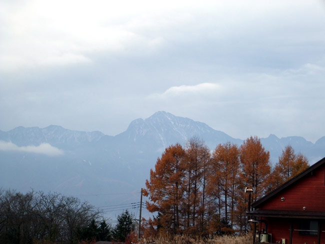 体に冷気が伝わってくるが清清しい高原の朝、ひとり散歩に出かけた。人も車もほとんど通らない坂道の上で、しばらく山容を眺めていた。風はほとんどなく、聞こえるのは近くを流れる側溝の水音だけ。褐色に色づき落葉の始まったカラマツ林の奥に見えた甲斐駒は、雄々しく壮麗であった。