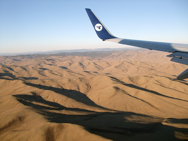すでに夕刻。茶褐色の大地がしだいに近づく。飛行機は徐々に高度を下げ、チンギスハーン空港に向け着陸体勢に入った。なだらかな山々と広々とした草原。わずかだが、小さな雪というより氷雪が、白い点や筋になって残っている所もある。