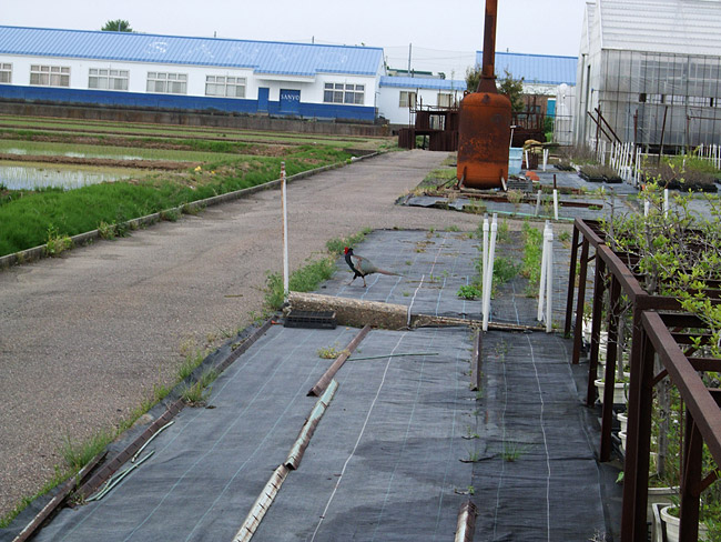 写真のほぼ中央にキジの雄が写っている。黒いシートの上にいるので、少し分かりにくいかも知れない。某社の温室の近くに現われた。