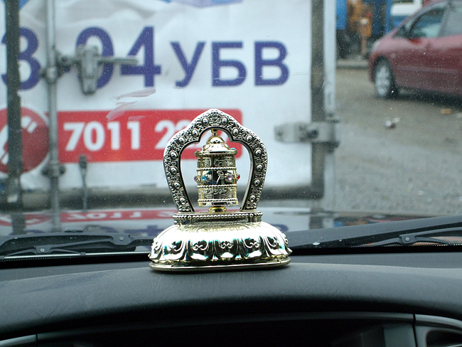 このホルドは、エヘガザル社のD社長が乗るレクサスのダッシュボードの上に取り付けられていた。この銀色の金属製お守りには、様々な装飾や模様が施されている。台座や五角形のワクにも、またそのワクの中で回る円筒部分にも細工がなされている。それらはいずれも宗教的な意味を持っているのだろう。とくに、その円筒には赤や青のガラス玉も嵌め込んであり、念入りに作られたものだ。小さいけれど荘厳で美しい。