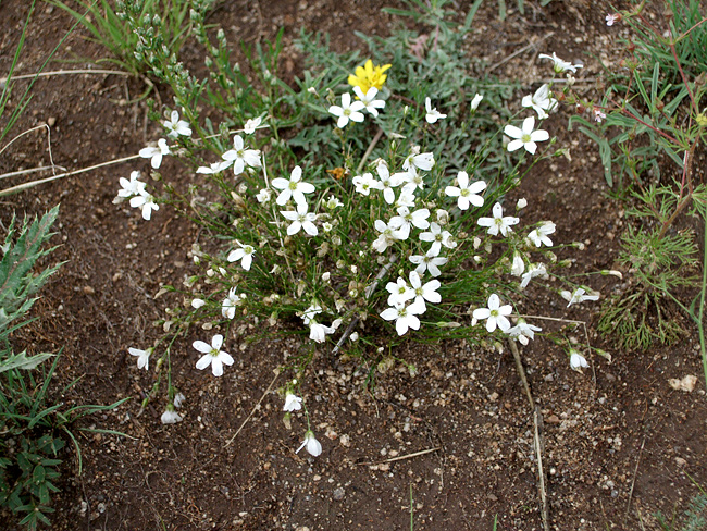 それに対して写真下の植物は草丈が低く、清楚でかわいらしい白花をたくさん咲かせていた。これはナデシコ科のタカネツメクサの仲間と思われる。たまたま、旅行ガイドブックの『地球の歩き方 モンゴル』にも載っていたし、植物事典で一応 確認もした。それで、誤りではなかろうと判断した。(ただし、前者『~歩き方』には植物については若干どうかな?と思える点も見えるが・・・。)