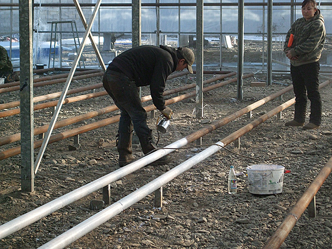 写真は、建設中のフジガーデンの温室である。上は外観で、この正面角の所が出入り口になる。また下は、暖房用の温水をまわすパイプに作業員が塗装をかけている場面だ。この装置がないと、冬場の温度維持がとてもできない。1月には、-30℃以下になることは珍しくないのだ。