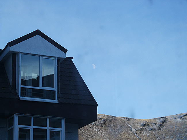 写真上はそうしたエリアに建ち、周辺でもっとも目立った邸宅で、その4階の一部とその彼方に見えた昼の半月である。このいわば豪邸、外から眺めた窓の数からして、部屋数は少なくとも十幾つはあろう。
