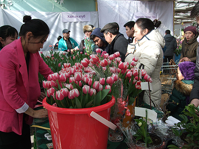 写真右はその切り花を直販しているところだ。3月8日の婦人デー当日、場所はソヨーチ・ガーデンセンターの臨時売り場である。モンゴルのお客さんたちは日本人と違い、蕾よりは開いた状態の花を好む。これは毎年感じる、おもしろい消費傾向だと思う。人々は3月8日の婦人デー当日には、満開のものから買い求めた。