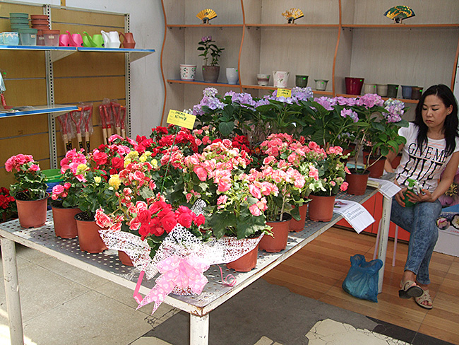 販売品の鉢花は、前号で紹介したアジサイと球根ベゴニアをメインに飾った(写真右)。さらに 写真では見えないが、右側にラベンダーとミント、それに五色トウガラシも並べてある。また 花以外の園芸資材では、横浜港から送った各種プラ鉢と受け皿,あるいは移植ゴテ,剪定バサミなども置いた。