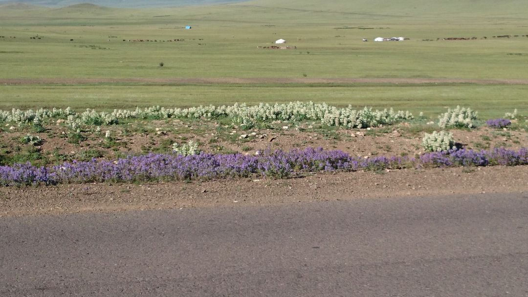 上の写真はそうした風景のひとつである。道路の縁にシソ科植物と思われる青紫と白の花が帯状に咲いていた。そして,その奥の方にはゲルが設置され、付近には放牧の家畜たちが見えた。はじめのうち路傍には前号で紹介した白花しか見えなかった。しかし,そのうち青紫の花も加わる。ちょっと埃っぽい景観だったが、悪くはなかった。そして,この帯状の群落はしばらく続いた。
