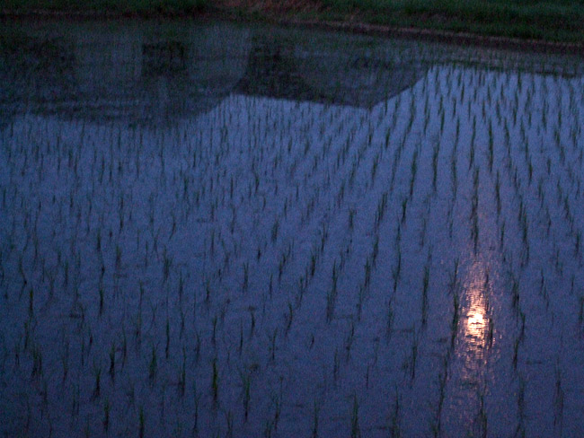 実を言うと、これは5月半ばの風景である。田植えから2週間ほど経ち、稲もしっかり根づいたが、まだ か細い。田には水がたっぷり張られ、水面が広かった。そこに映った月とビニールハウスである。その立ち並ぶハウスには主にアザレアが入っている。秋出荷向けで冷蔵前のものである。田んぼと鉢花栽培のビニールハウスが共存する風景は、この地域の農業の縮図である。